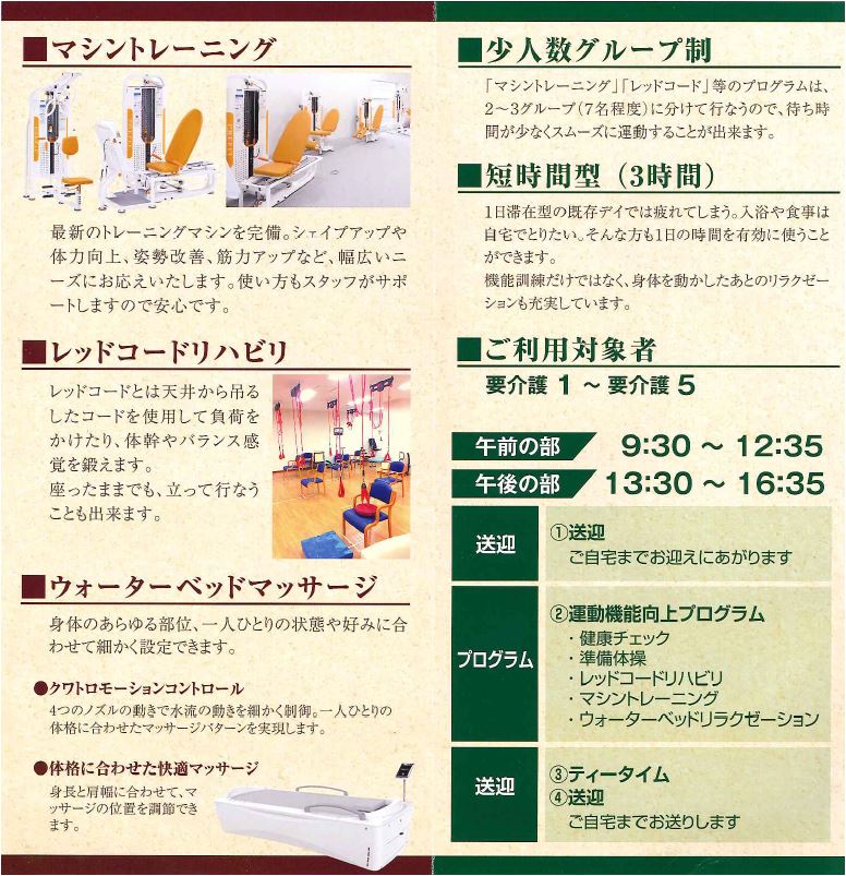 実施しています。お一人おひと. りに合ったプログラムをご提. 案し、日常生活の動作改善に. 役立てます。<要申込>. デイサービス(日帰り介護施設)をこの機会にご体験ください. 送迎付. 大浴場で日替り風呂. スタッフの介助でゆっくりご入浴! 個別機能訓練! |