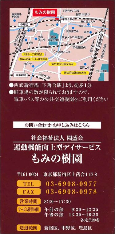 を提供いたします。デイサービスと異なり、短時間で集中的にリハビリを受けることが出来ます。 通常のデイサービスのプログラムは不要で、リハビリだけに集中したい。 要介護認定を受け 目白駅より、およそ2km以内(送迎ルートの関係もございますので、詳細はお問い合わせください). 送迎車 〒171‐0031 東京都豊島区目白2-38-2 TEL. |