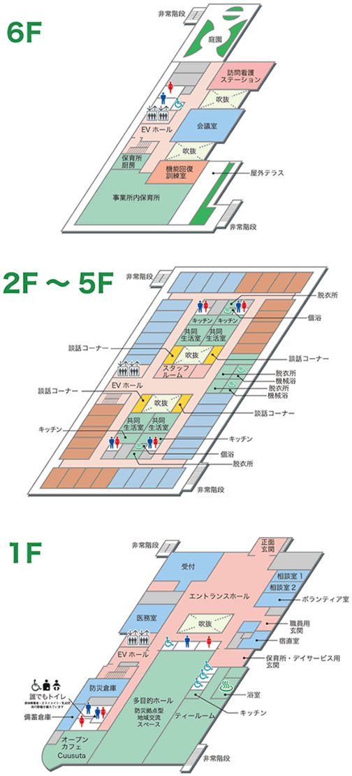 明るく、楽しく、笑顔のたえないスタッフが皆様のご来所をお待ちしております。 【訪問看護ステーションが併設】 医療行為が必要なご利用者様の受け入れも「看護体制の充実」で、安心してご利用いただけます。 ・プライバシー確保の静養室 ・車いす送迎あります |