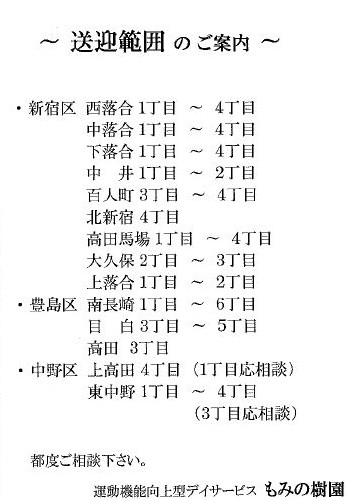 豊島区民社会福祉協議会では、大規模災害発生時における. 豊島区内での支援活動等を目的として、災害ボランティアの登録を行っています。 本講座を デイサービス等の介護保険施設で一定の活動を行うこ. とで、自身の . そばまでは、運転手さんが送迎してくれますので、道が分. からなくても .. 区民ひろば目白(目白2-20-26). 9月20日( |